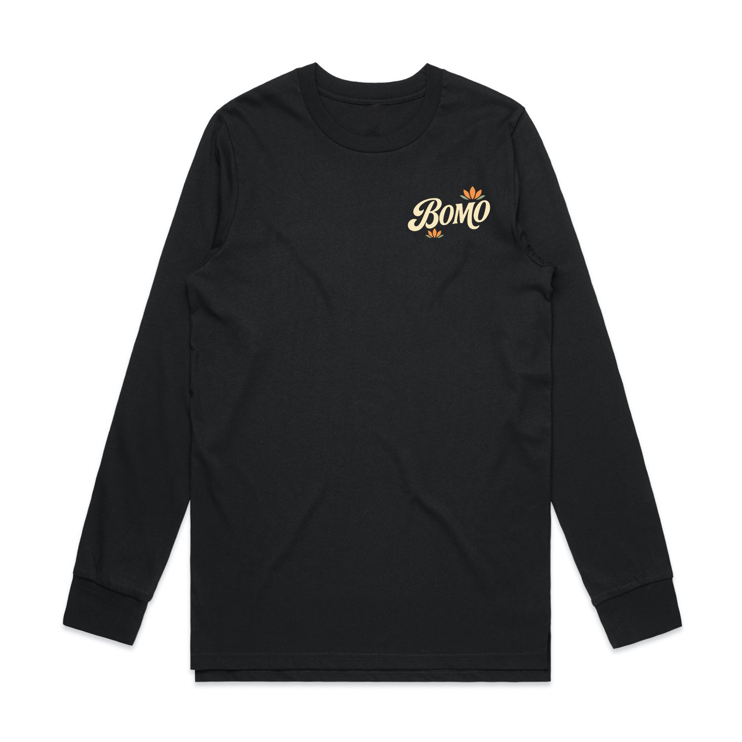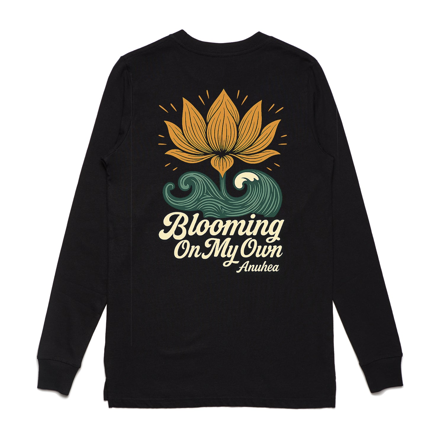 Made from 100% cotton, this ultra-soft, high-quality long sleeve tee features the exclusive Limited Edition Blooming on my Own logo on the back and a fun BOMO design on the front. Perfect for those cooler nights when you want style without the bulk of a hoodie!